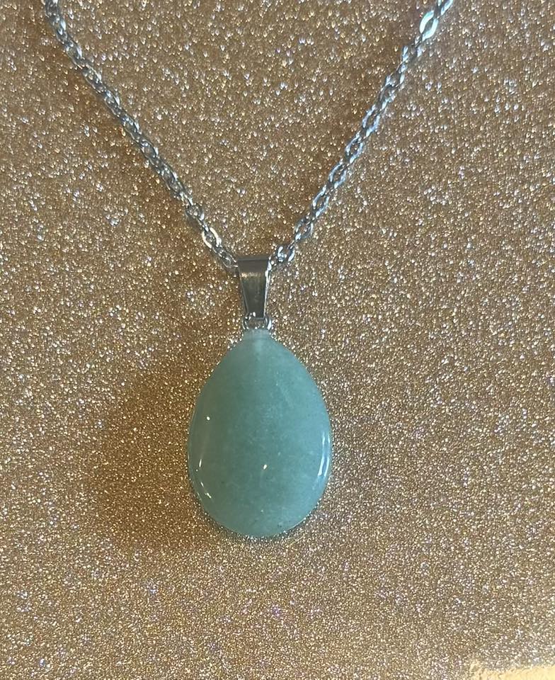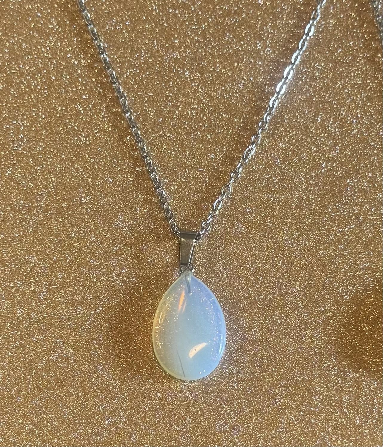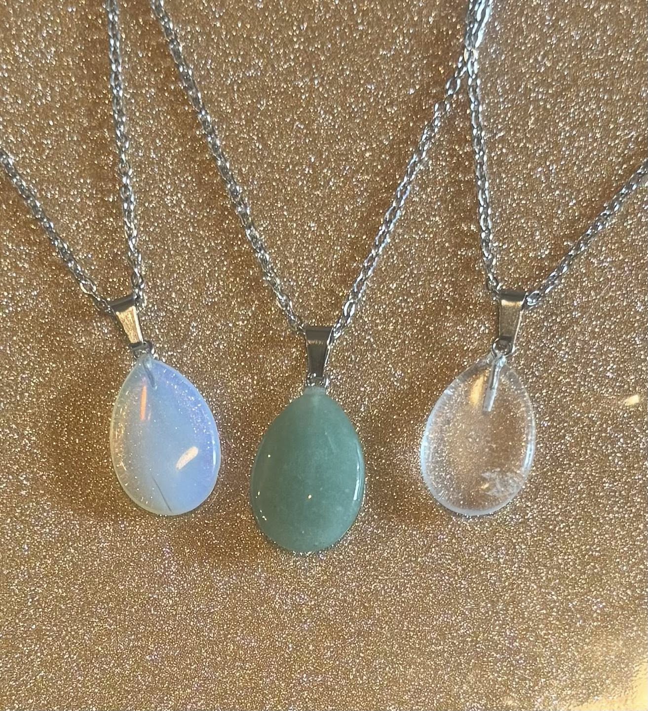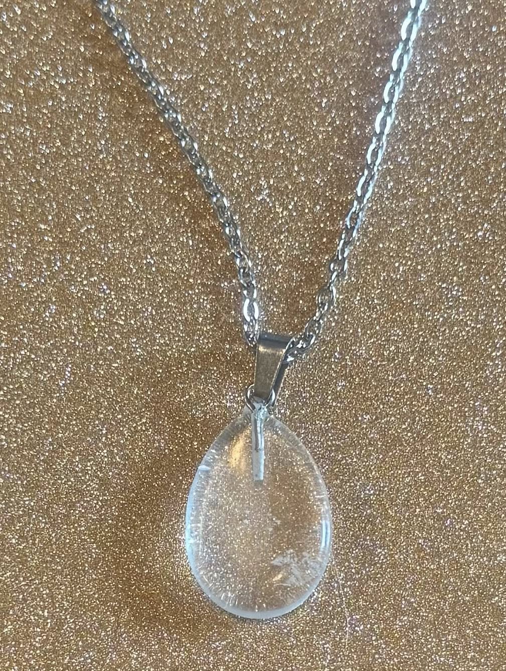 Carved crystal teardrops on a 17 in stainless steel chain.