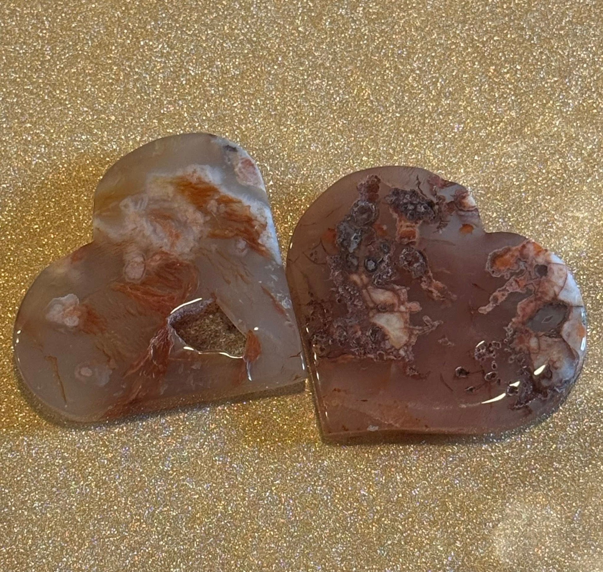 3 by 3 by 3/4 inches and 107 grams beautiful flower agate heart carving with a touch of carnelian agate.