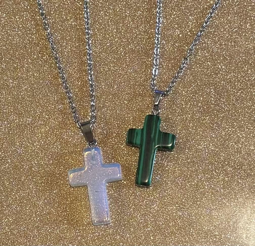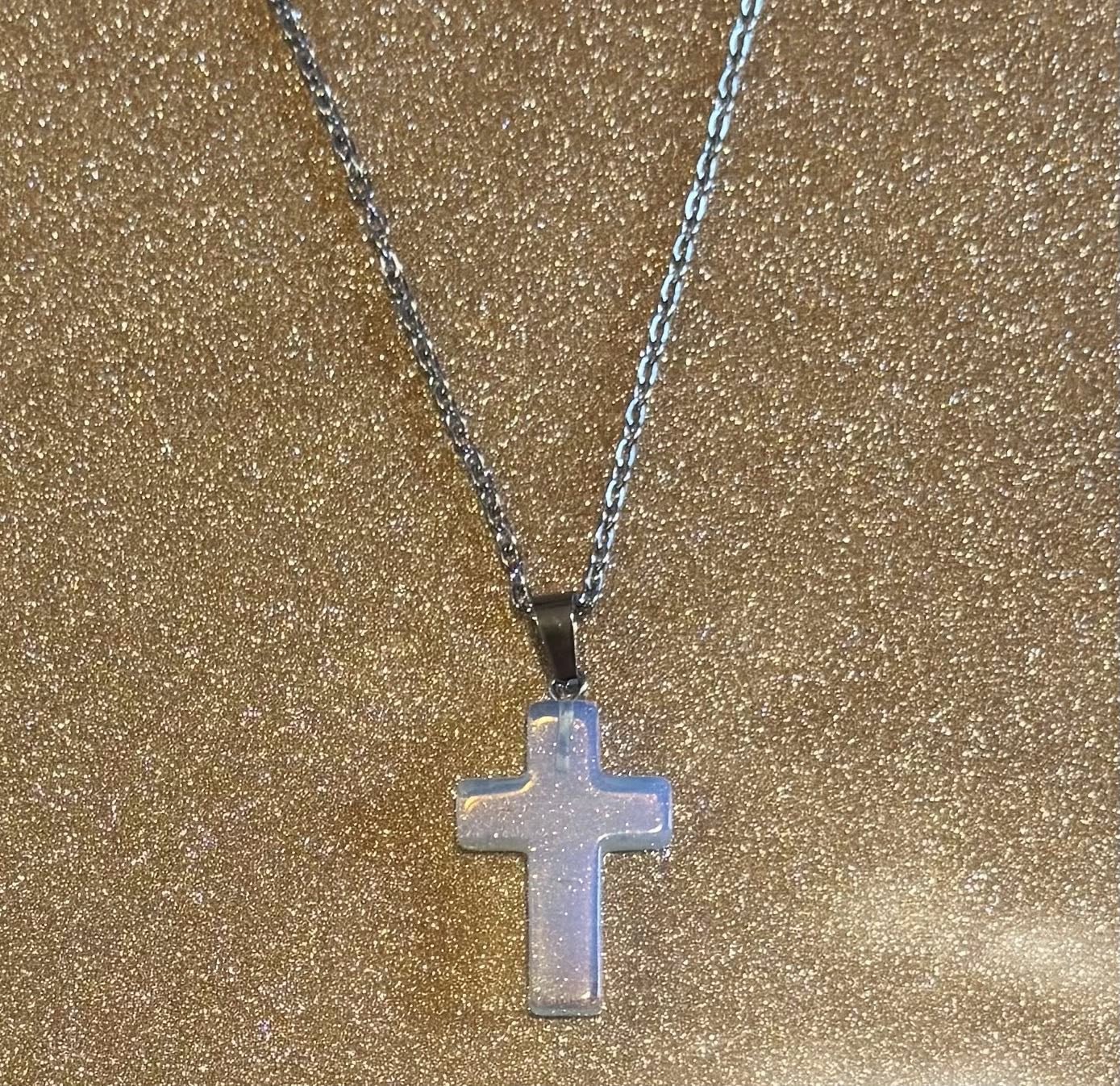 Carved crystal cross on a 17in stainless steel chain.