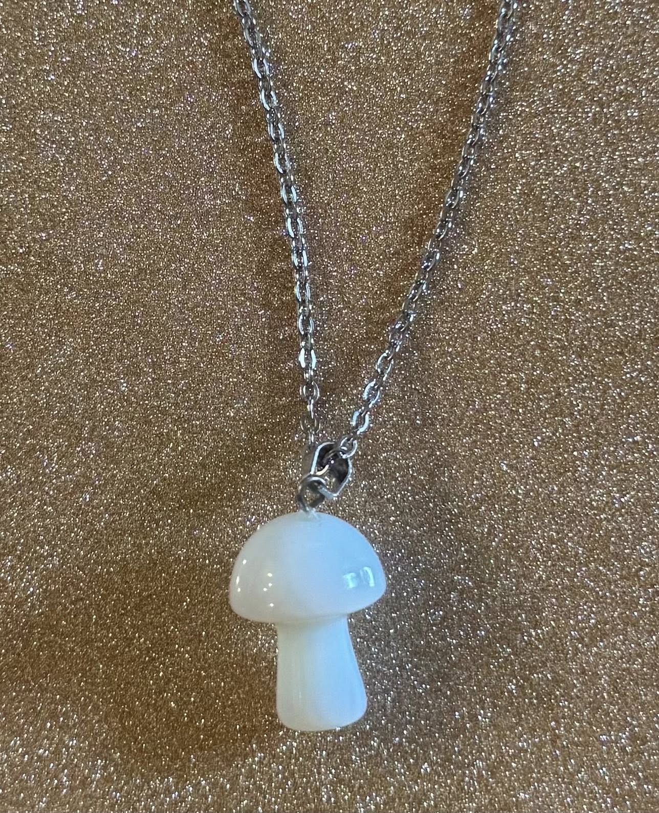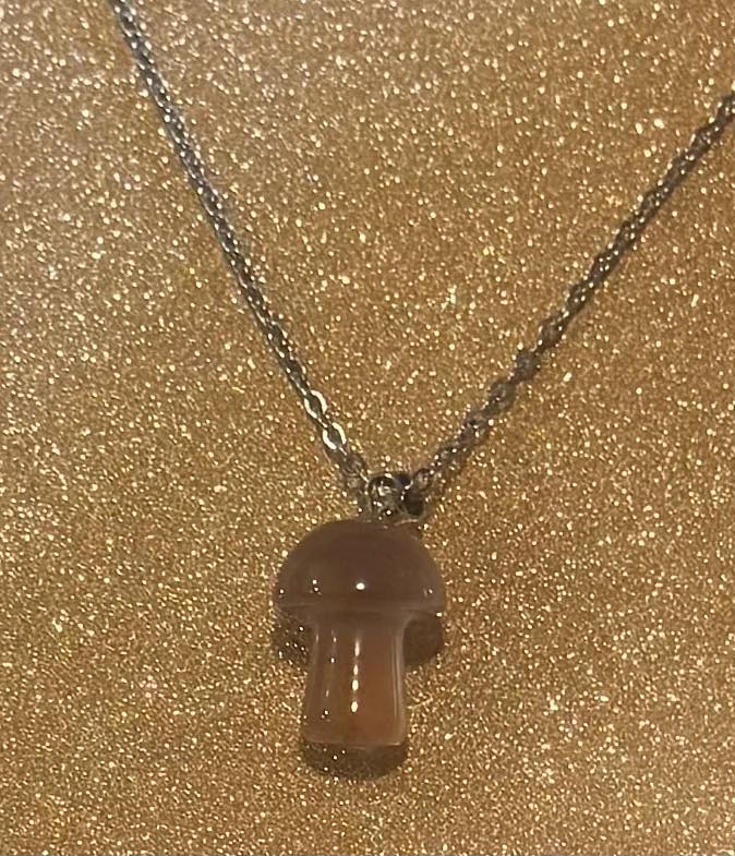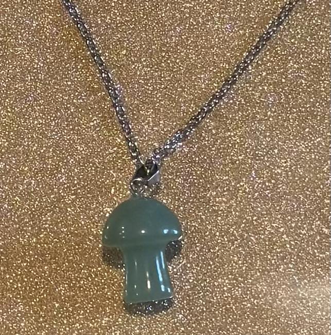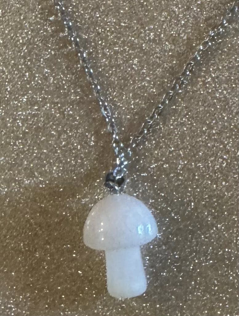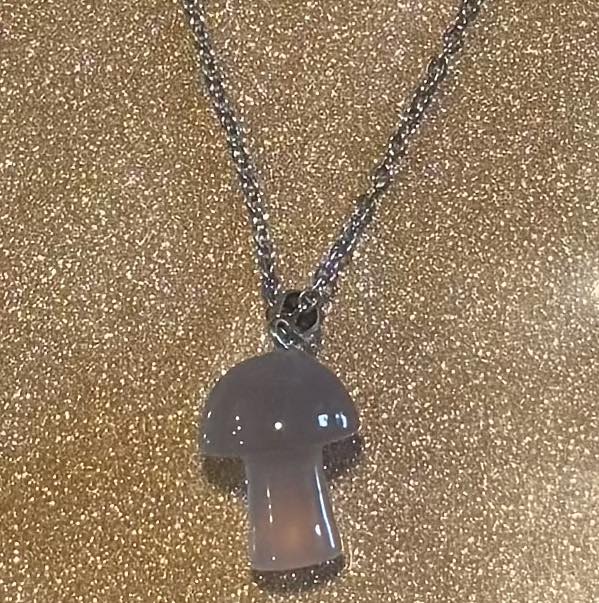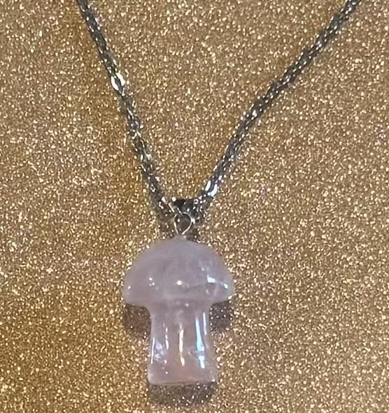 Crystal mushroom on a 17 1/2-in stainless steel chain.