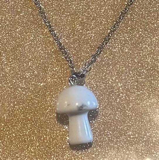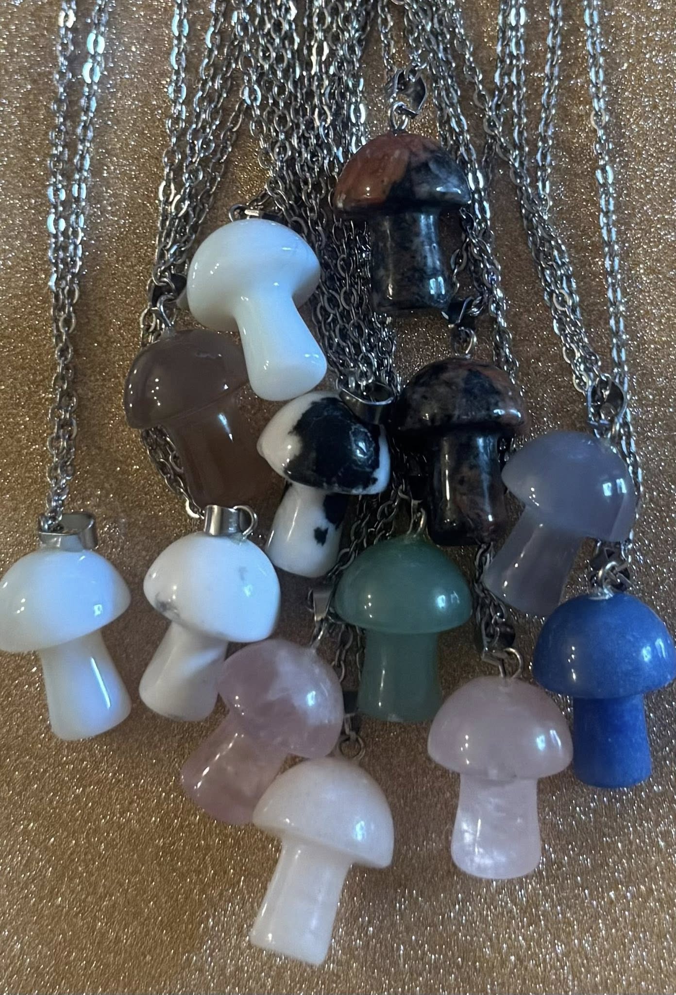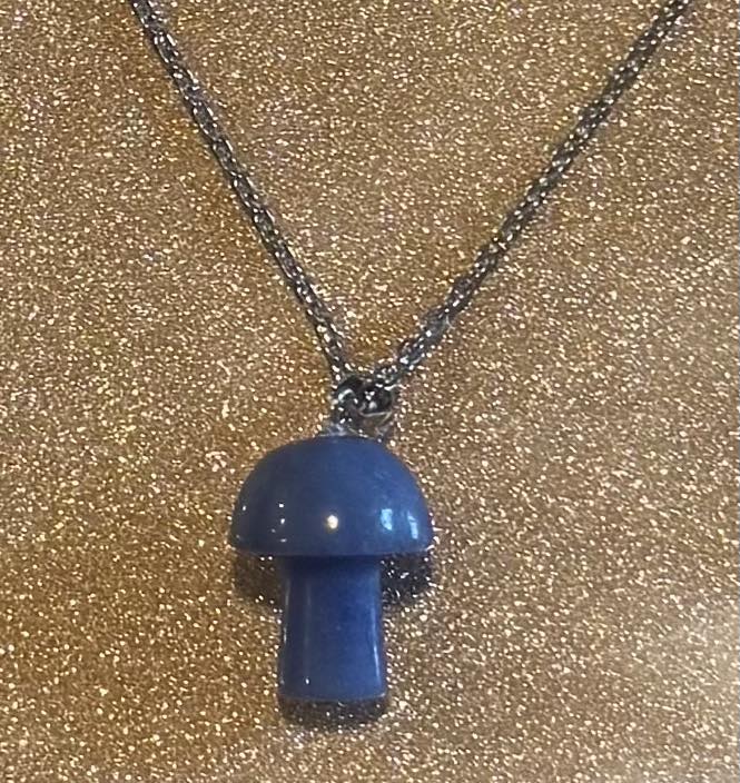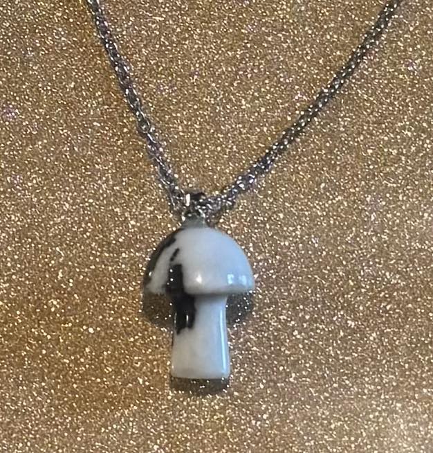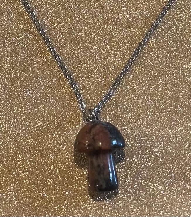 Crystal mushroom on a 17 1/2-in stainless steel chain.