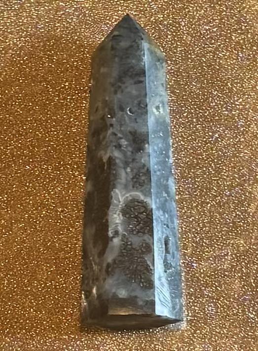 3 by 1 by 1 inch and 44 grams, small ocean jasper point with a tiny bit of drusy.