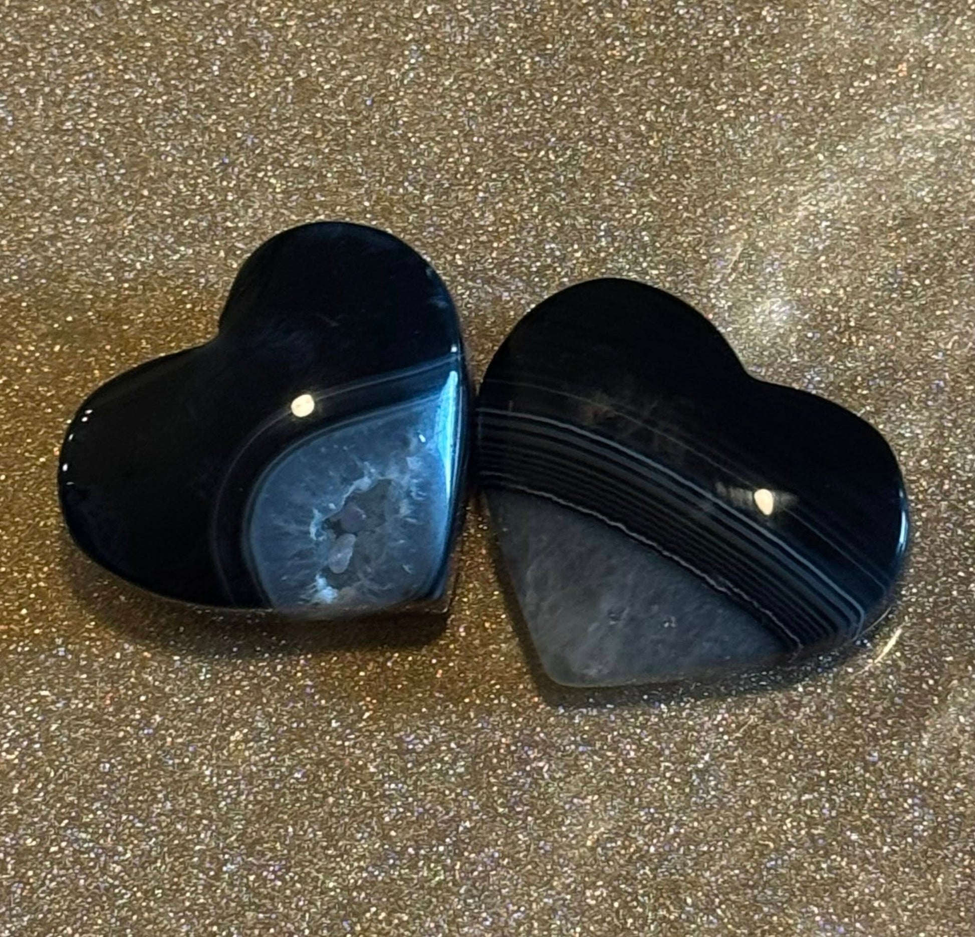 2-inch onyx heart carvings ranging from 44 to 60 grams each with beautiful drusy.