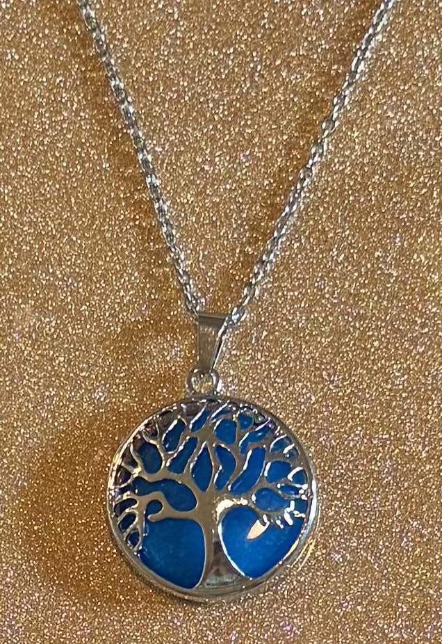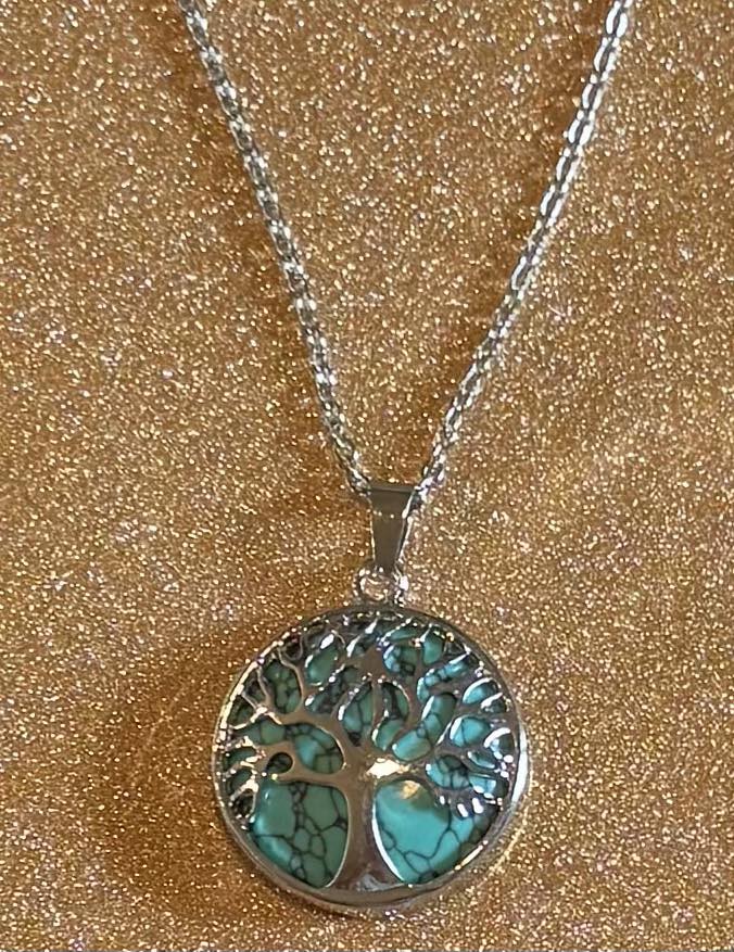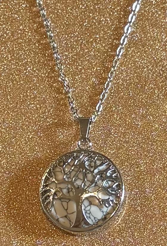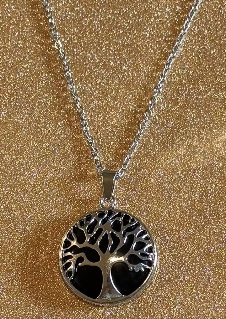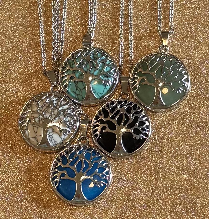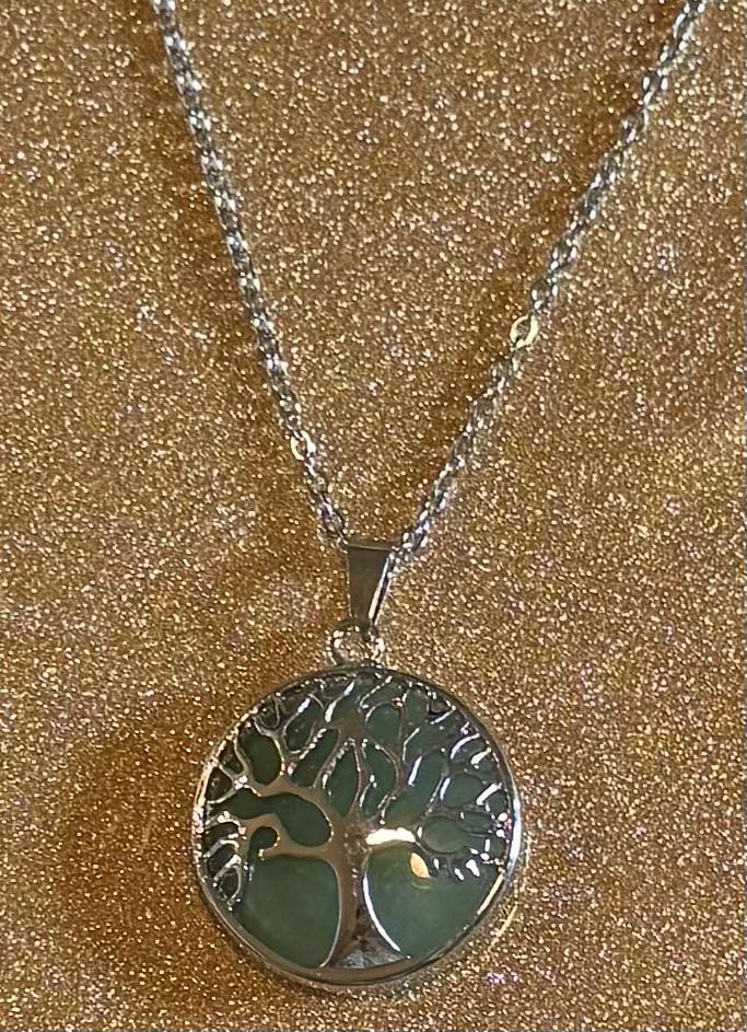 Solid crystal behind tree of life pendant on a stainless-steel chain.